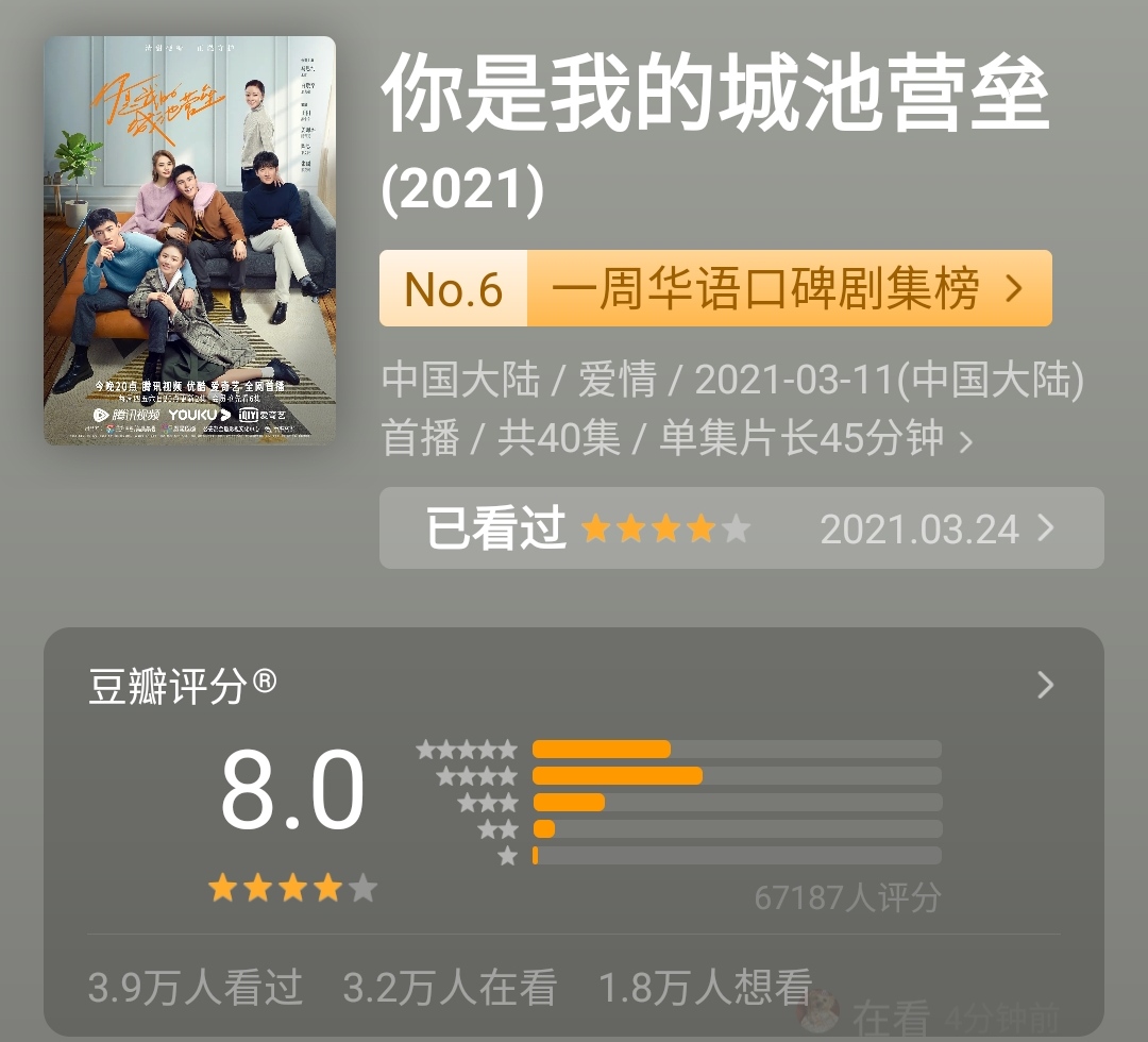 由张彤执导,马思纯、白敬亭、王阳、姜珮瑶、陈昊、张瑶联合主演的电视剧《你是我的城池营垒》正在多个平台火爆播出,凭着“军加医”的新颖职场设定,中国版实习生格蕾加青春版战狼的CP,始终获得全网热追,播放量居高不下,豆瓣8.0分,叫好又叫座。