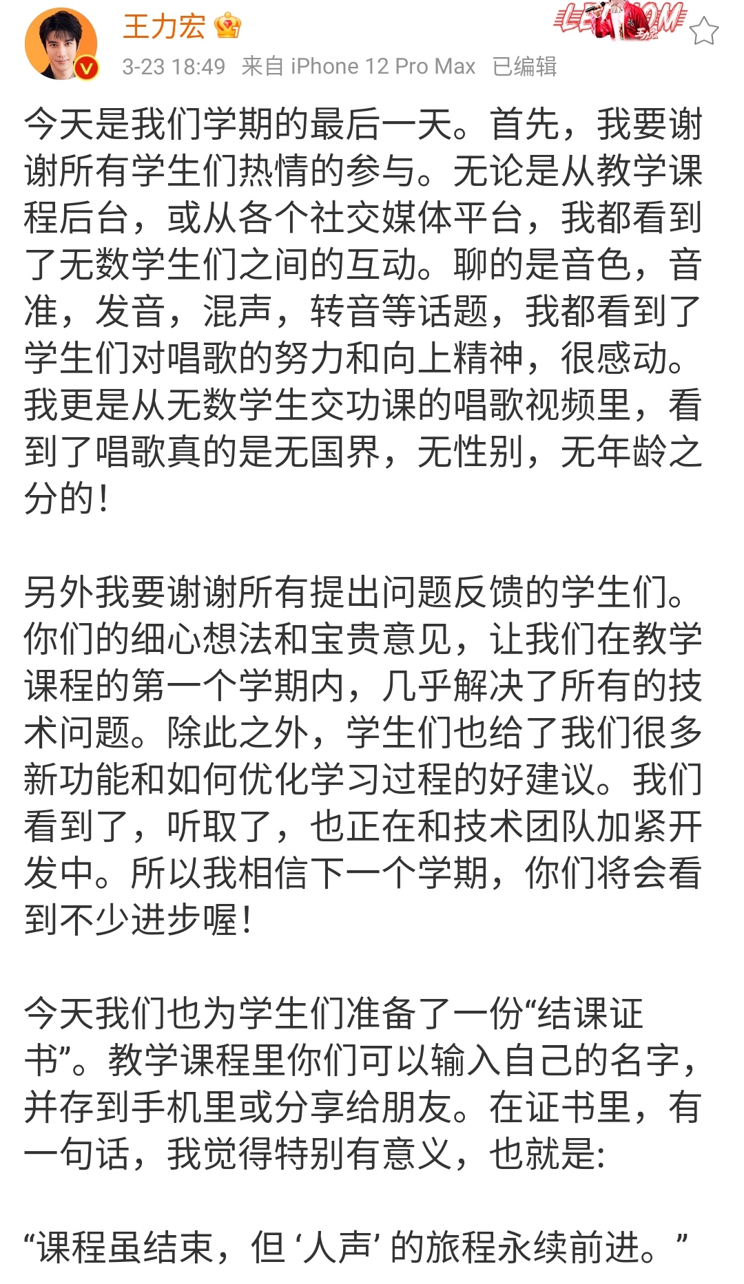 王力宏本人在事业成功后也非常开心,上网发长文表示收获颇丰,难舍师生情,希望和大家下学期再聚。