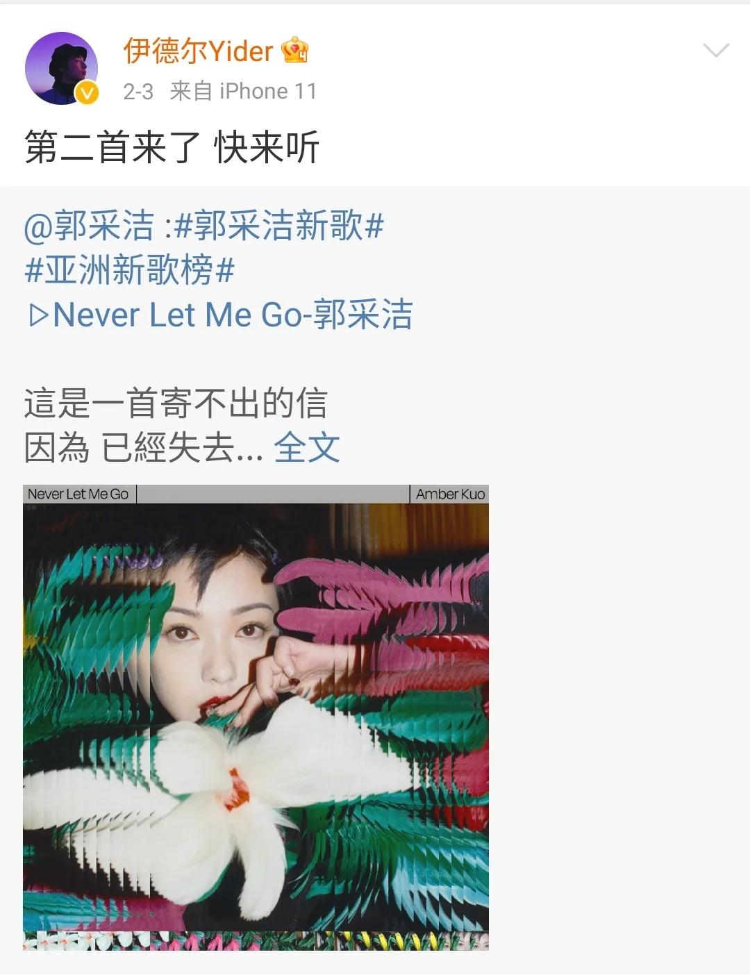 因为音乐的强大吸引力,两人随后迅速以合作者的身份建立友谊,郭采洁在2019年11月,伊德尔生日当天送出祝福,成功闯入对方的生活空间,不难想象当时已经擦出了火花。