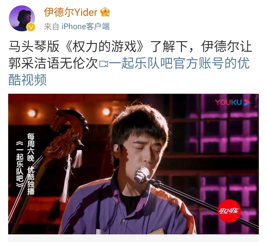 第一。2019年8月,伊德尔第一次亮相节目,就凭着一曲马头琴版《权力的游戏》引发了郭采洁的关注和喜爱,伊德尔当时自豪的发文说自己让郭采洁语无伦次。