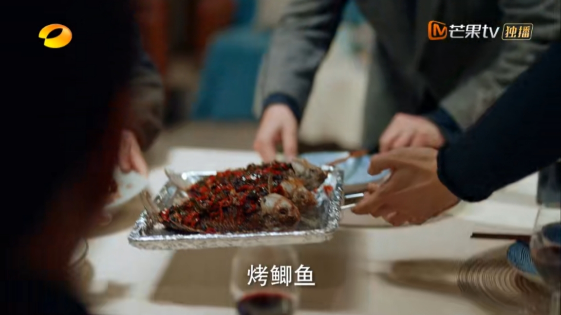 这道菜哪哪都好,可惜只有一个细节不够完美,给剧组减分了,那就是明明刚从电烤箱里面小心翼翼端出来的鱼,却一丝热气都没有,很明显是好看不好吃的摆设,这也解释了为什么全桌人都拼命灌酒,没有一个人挟一口菜。