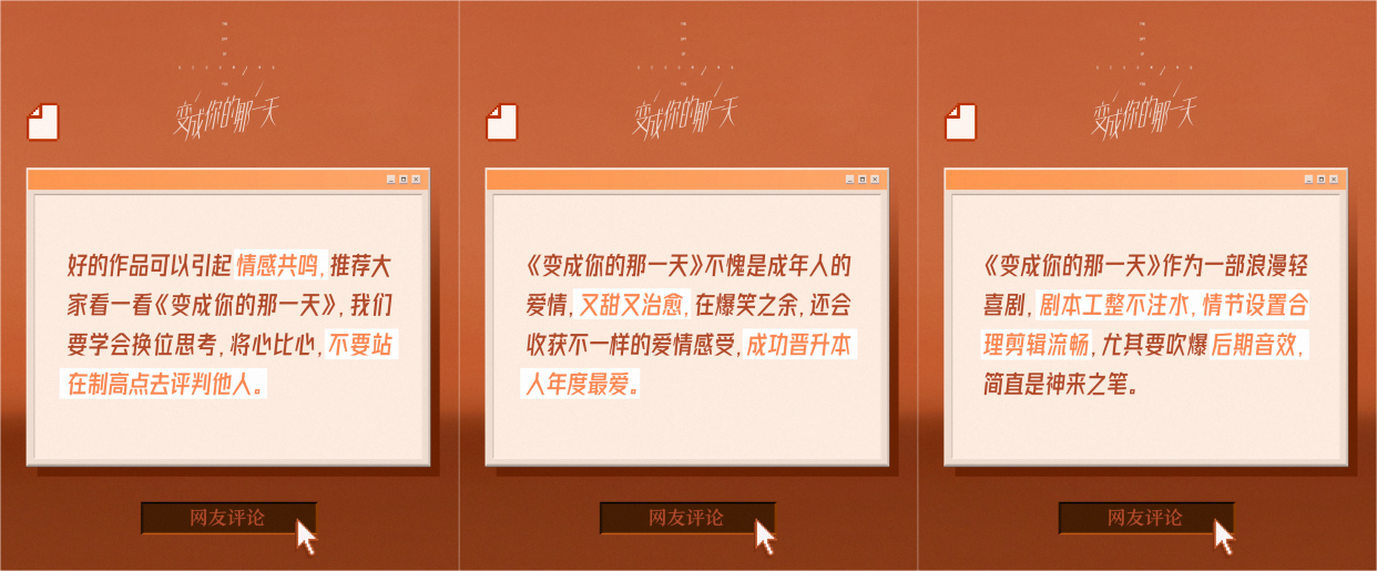超高的网络热度之外,《变成你的那一天》口碑也一路飙升,以豆瓣8.0、知乎9.1,高达91%的推荐度拿下今年爱情甜剧最高分,可以说是实至名归。凭借高能情节和人物角色吸引观众,结合换位思考、娱乐圈生态、女性话题等相关剧情引发热议。大明星江熠(张新成饰)与女娱记余声声(梁洁饰)互换身份之后,上演了各种“一定要穿内衣”、“是我们的大姨妈”等让人手足无措的尴尬情节,但也让追剧观众们为此津津乐道。余声声为了维持江熠的明星体态被迫节食,饿到把“盘了7年的核桃拿门夹了听了个响”;两人为了换回正常身份使尽浑身解数,死马当活马医最后“马都死透了”等桥段,贡献不少刷屏级名场面引发爆笑之余,也带给观众更多内核思考。截然不同的两个人开始学习如何站在对方的角度和立场,彼此了解与尊重,是《变成你的那一天》向观众传递的“只有真诚才是通往对方内心的钥匙”这一正向爱情观的核心。剧集的精品内容自带高光,热播期间#变成你的那一天太上头了# 等话题引发破亿讨论收割大批自来水,让无数网友化身安利小分队,实力破圈。