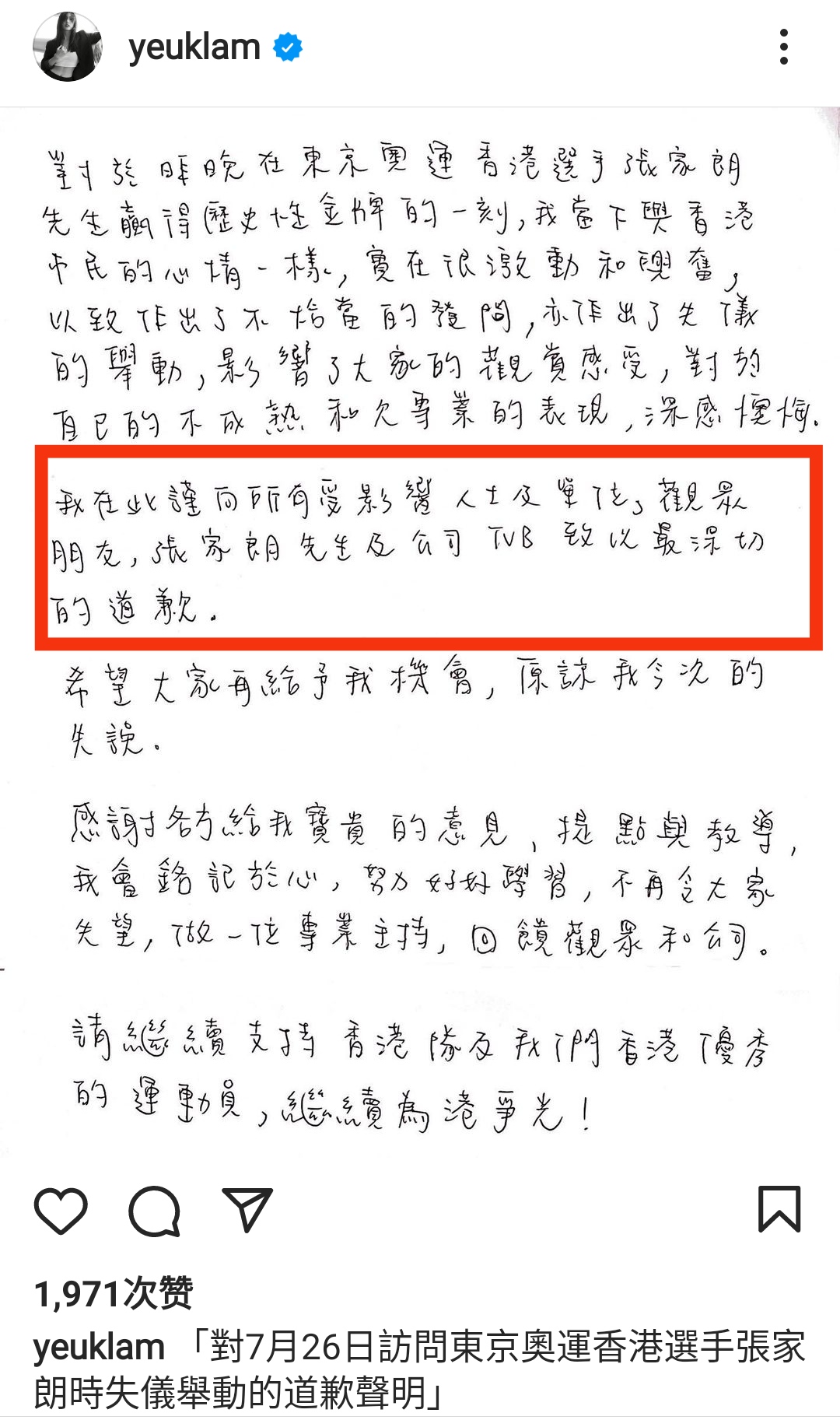 对于昨晚在东京奥运香港选手张家朗先生赢得历史性金牌的一刻,我当下与香港市民的心情一样,实在很激动和兴奋,以致作出了不恰当的发问,亦作出了失仪的举动,影响了大家的观赏感受,对于自己的不成熟和欠专业的表现,深感懊悔。