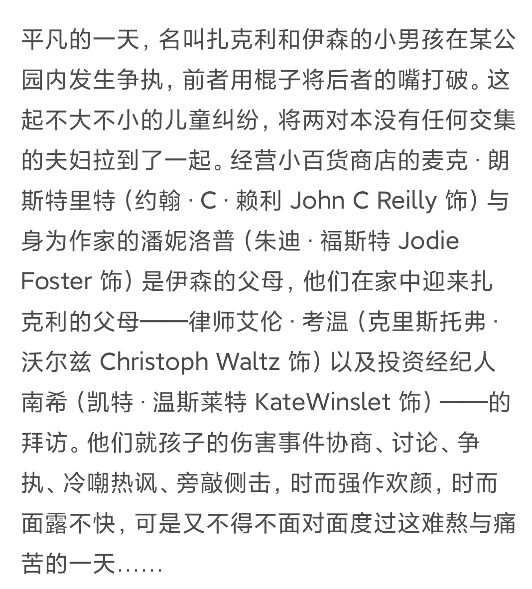 《杀戮》是波兰斯基拍摄于十年前的作品,由凯特温斯莱特和朱迪福斯特两位奥斯特影后,以及最佳男配角克里斯托弗瓦尔兹联合主演,故事梗概如下。