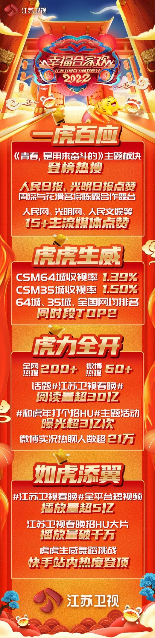 晚会反响非常热烈,《青春,是用来奋斗的》主题板块登榜热搜,助力冬奥的周深与花滑名将陈露的合作获得人民日报、光明日报点赞,主流媒体对晚会累计肯定表扬超15次。晚会CSM64城平均收视1.39%,CSM35城平均收视1.50%,64城、35城、全国网等多网别排名同时段第二。收视爆表的同时,网络热度随之水涨船高,#周深杨洪基四代同堂合唱错位时空##刘宇宁烟火星辰舞台# #张弛比王皓更懂史策# 等话题引发全网热议,微博主话题#江苏卫视春晚# 阅读量超30亿,晚会全平台短视频播放量破5亿。