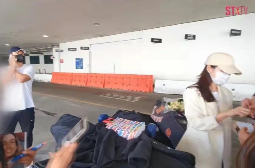 这也是两人结婚十余天来第一次公开露面,从网友公开的视频来看,玄珍夫妇并没有预料到这样的局面。两人推着行李车走出机场出口的时候,发现守候已久的粉丝,玄彬开始打电话联络车辆,孙艺珍则趁着闲暇为大家签名合影。