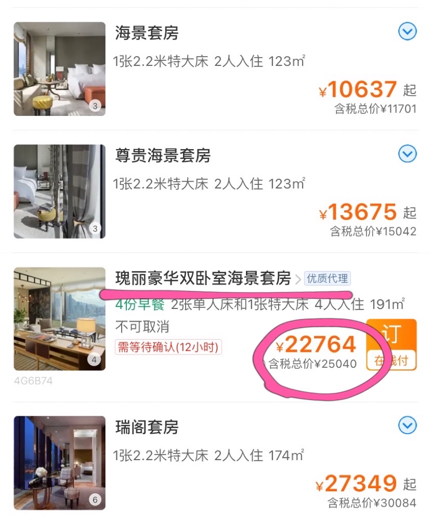 这间套房的价格有点超出想象了,是普通房间的十倍,入住一晚大概在2万多块。赶上不少城市一平米的房价了。