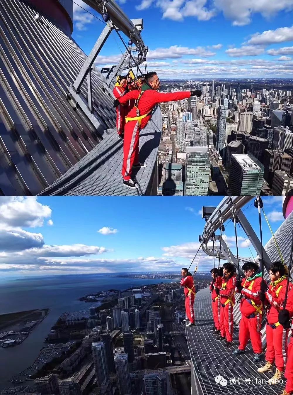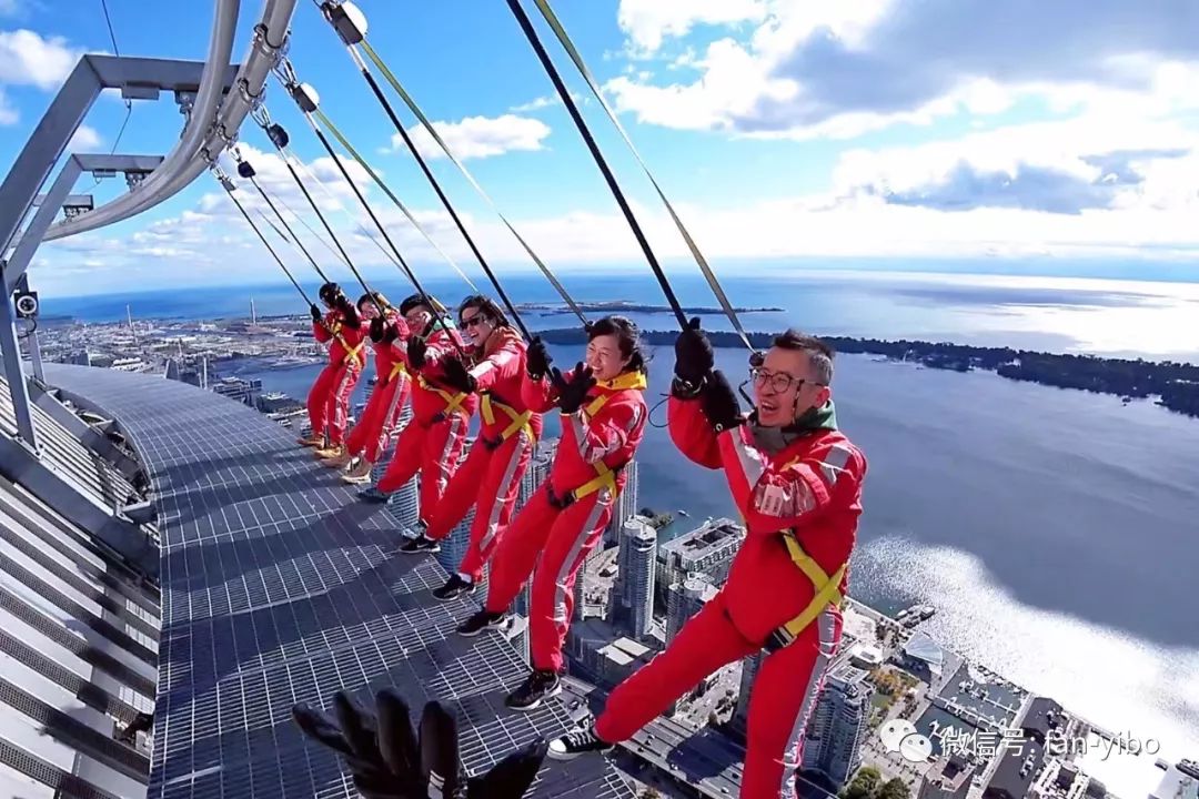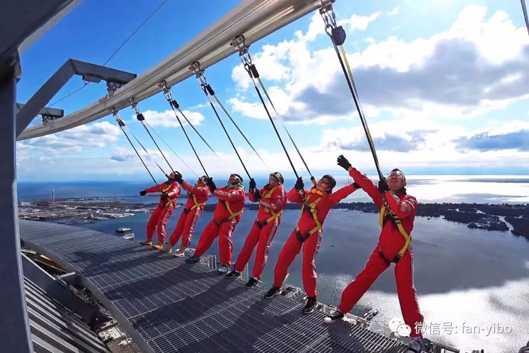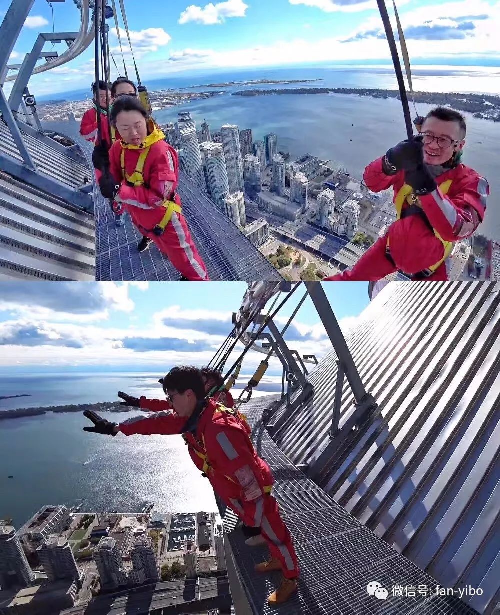 这是全世界最高的环形无辅助高空行走项目,沿着电视塔顶端主甲板宽度为1.5米的外围边缘行走一个完整的圈,距离地面356米(116层楼高)。脚尖踩着甲板的外沿,凌空后仰打开双臂;或者是向前俯冲,哇哈哈,这完全通透的安大略湖和多伦多美景,果然美丽壮观。