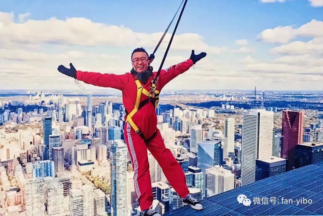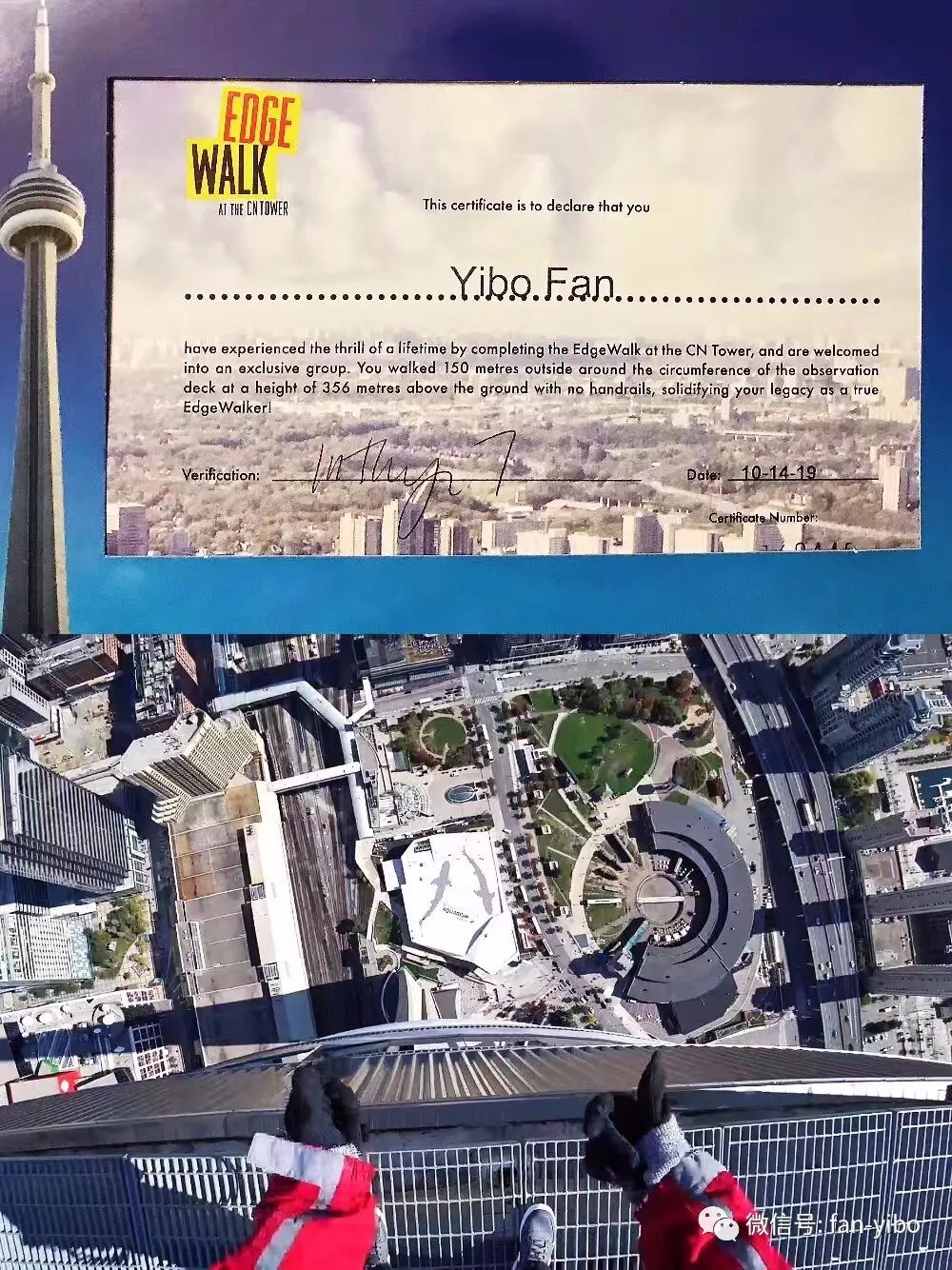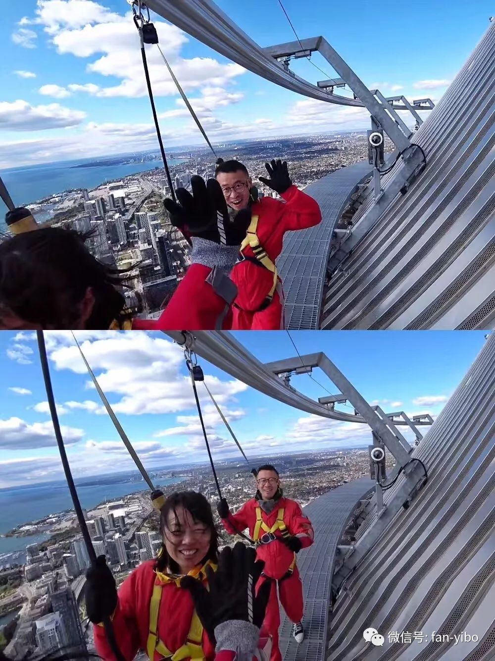 这是全世界最高的环形无辅助高空行走项目,沿着电视塔顶端主甲板宽度为1.5米的外围边缘行走一个完整的圈,距离地面356米(116层楼高)。脚尖踩着甲板的外沿,凌空后仰打开双臂;或者是向前俯冲,哇哈哈,这完全通透的安大略湖和多伦多美景,果然美丽壮观。
