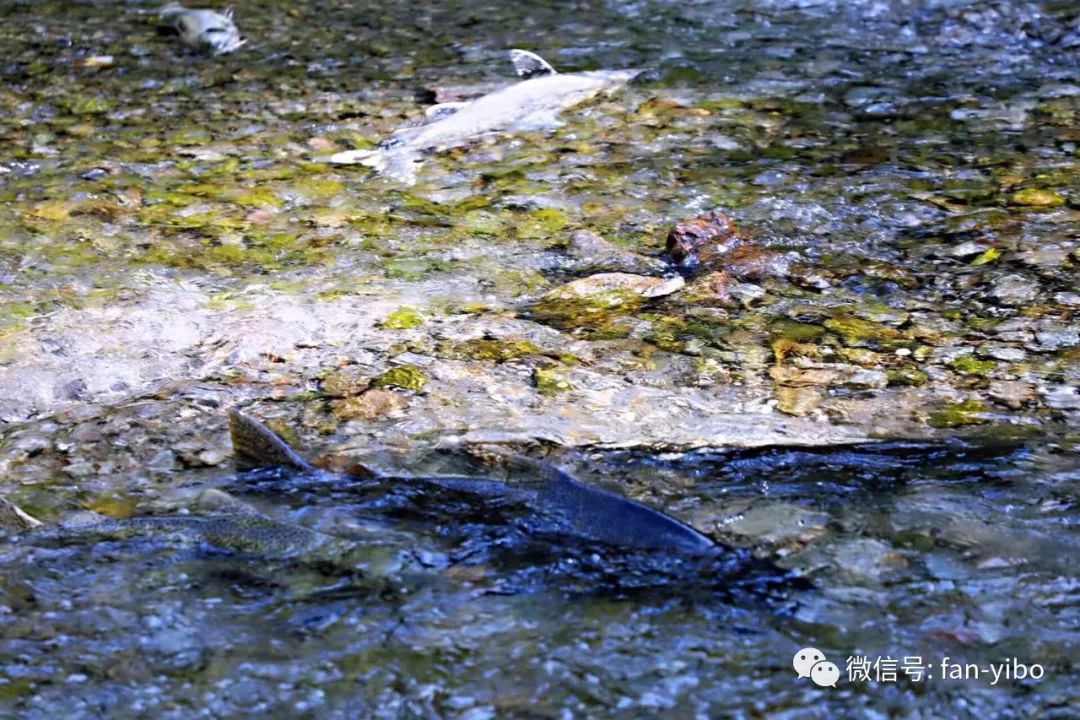 我们来到新娘面纱(Bridal Veil)瀑布的底部,无数洄游的鲑鱼在此聚集,无奈瀑布横拦在此,只能纠结于此反复挣扎,直到死去。这种死法是有些悲壮,但选择在这样一个漂亮的地方,鱼儿们也算是去了天堂吧。