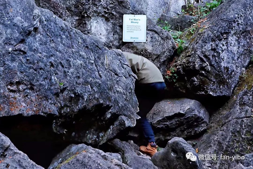 沿着园子里的徒步线路,在巨石和山洞间穿行。这里有一处极为狭窄的石缝,叫做Fat man’s Misery,直译就是胖子的辛酸。原因吗,看图片你懂的。。。