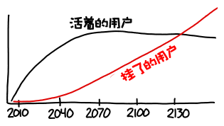 决定死人账号数何时超过活人账户数的关键因素在于Facebook的新增用户速度——一般是那些年轻人——能否快过老用户死亡的速度。