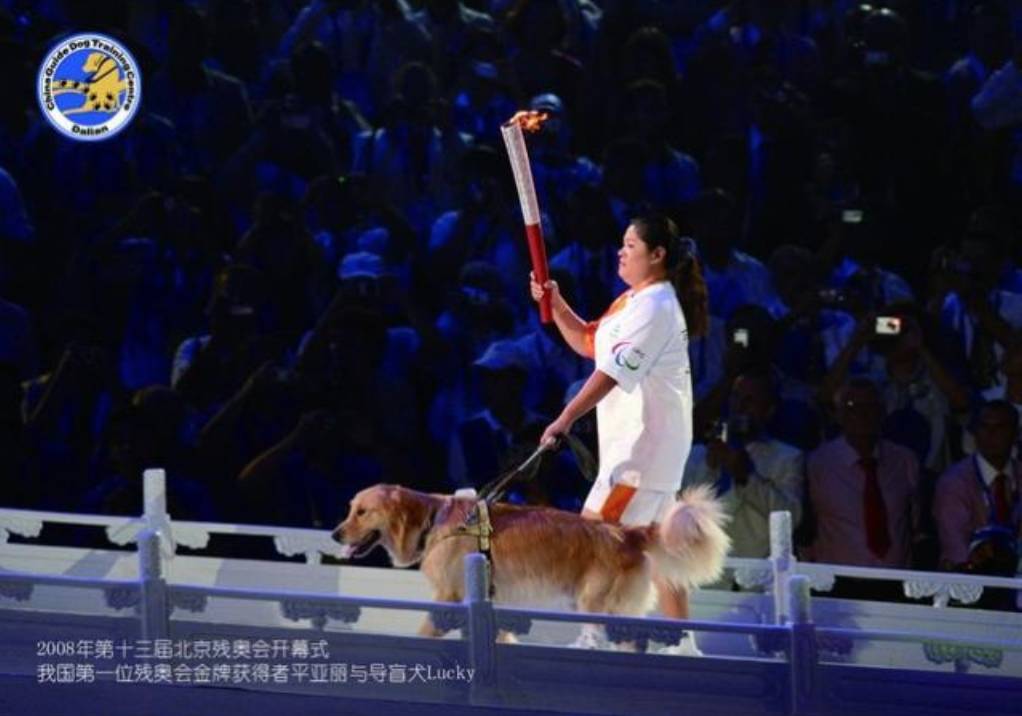 2008年北京残奥会开幕式上,中国首枚残奥会金牌获得者平亚丽在导盲犬LUCKY的陪伴下将圣火传递给最后一棒火炬手。这只叫LUCKY的导盲犬,就是大连导盲犬基地培训出来的中国第一批导盲犬之一。