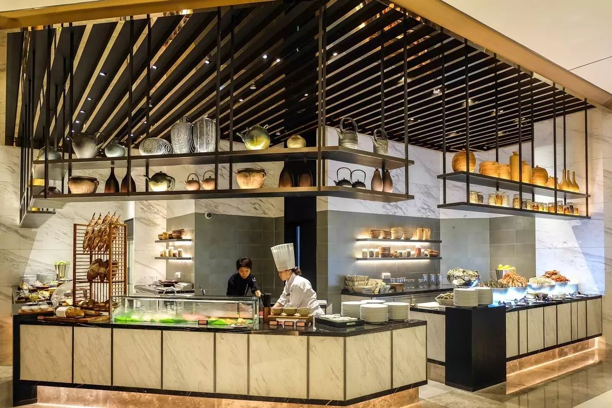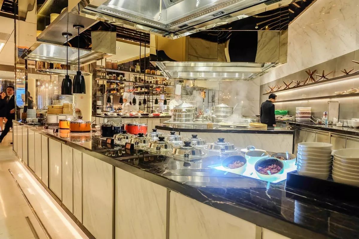 “伍臻”全日餐厅提供自助早餐、自助晚餐、周日早午餐及全天零点服务。餐厅以五个互动式厨房为特色,包括海鲜档、特色面档、中式料理、地中海厨房、甜品总汇区,由顶级大厨现场烹饪,呈现独具中式风情的本地菜肴和国际美食,带领食客进入新概念“现场美食剧院”。