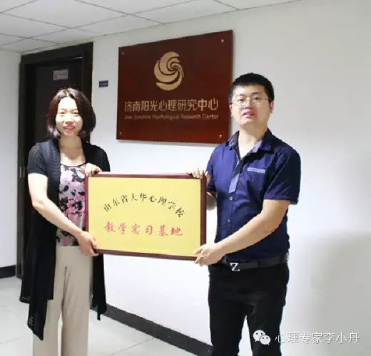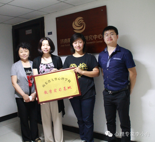 2015年5月26日上午十点,在济南阳光心理研究中心举行了“山东省大华心理学校教学实习基地”揭牌仪式,济南阳光心理研究中心主任李小舟、办公室主任刘丕青,山东大华心理学校副校长申晓阳,办公室主任冯宁出席并参加了整个仪式。