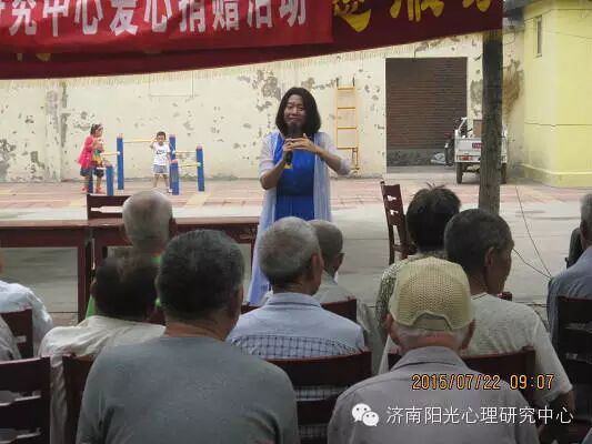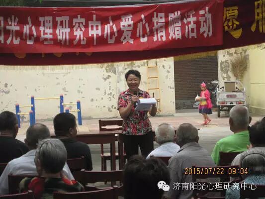 济南阳光心理研究中心办公室刘主任代表中心暖心志愿团,主持了“暖心工程”之“送爱心,送快乐,送祝福”的爱心进社区活动。