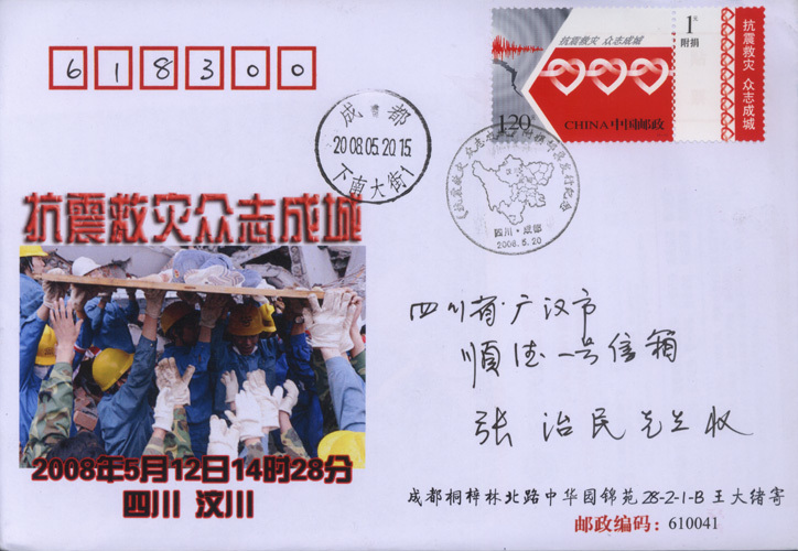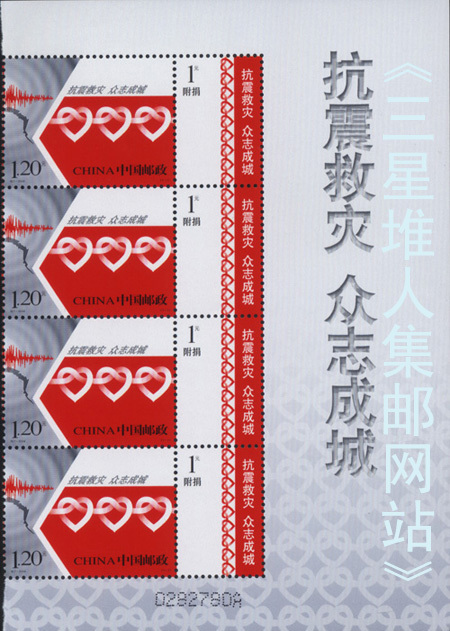 2008年5月20日特别发行《抗震救灾众志成城》附捐邮票1套1枚。详情如下: