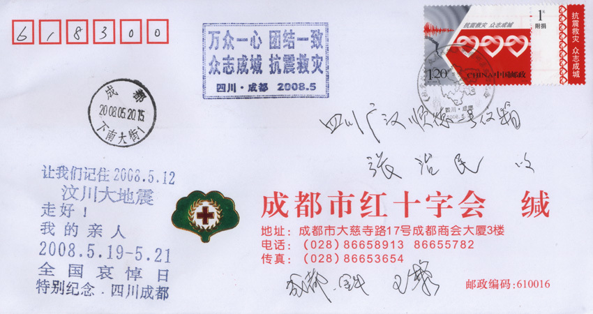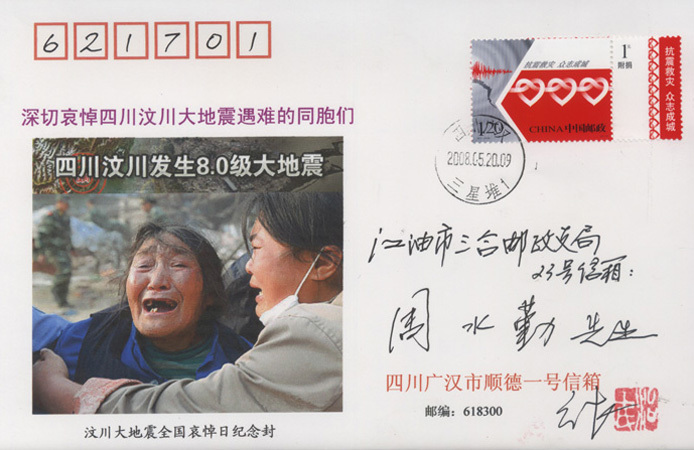 《抗震救灾众志成城》附捐邮票首日实寄封点击看大图