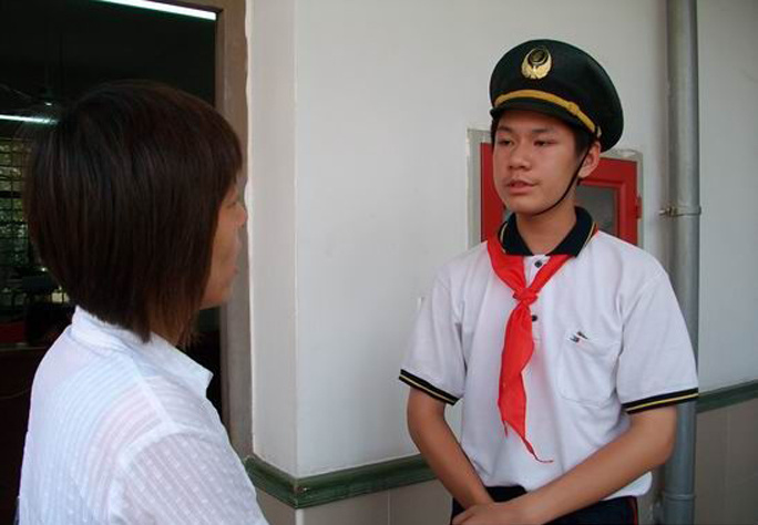 第一任宝山少年邮局局长吉贇昊接受采访。