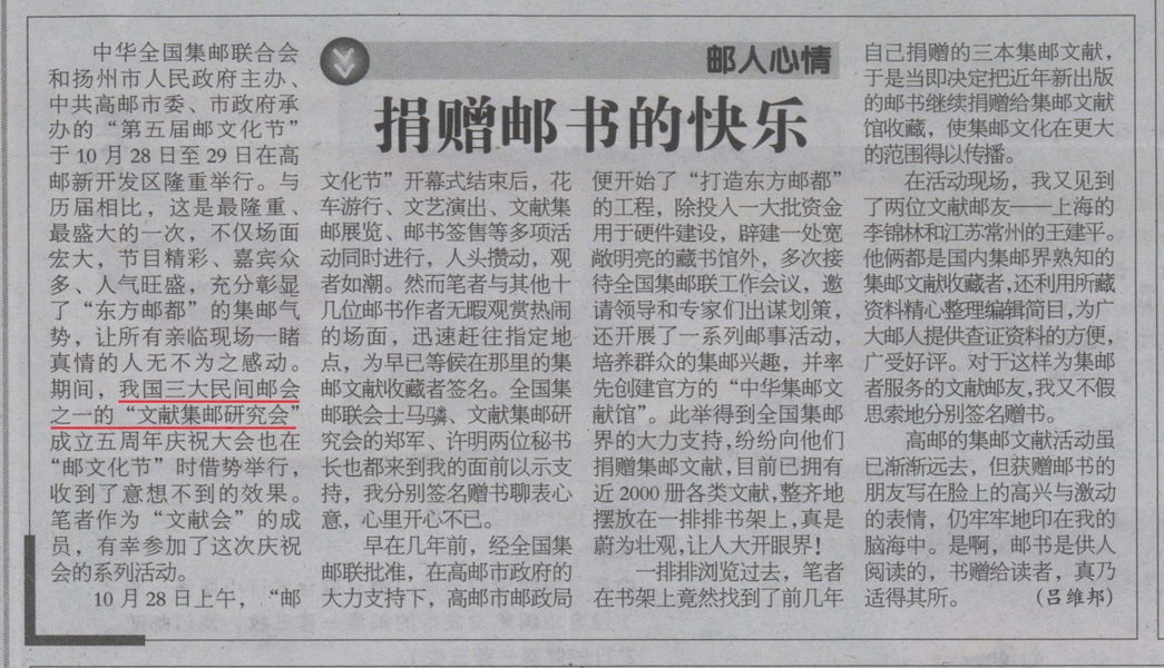 刊登了吕维邦先生文章“捐赠邮书的快乐”。