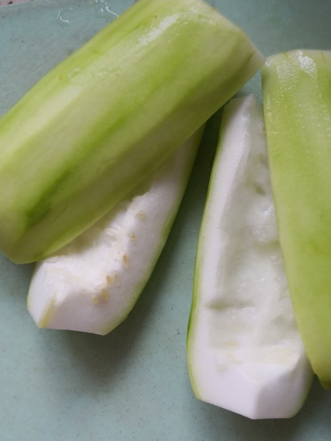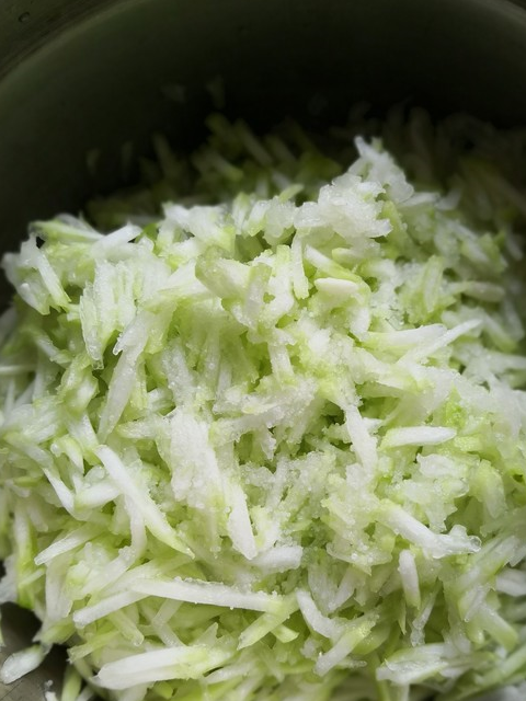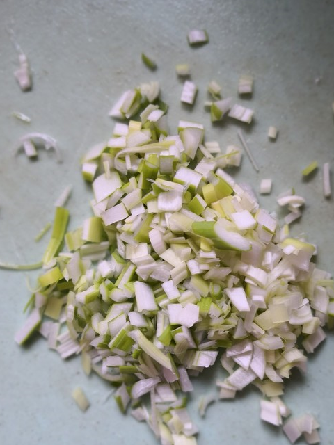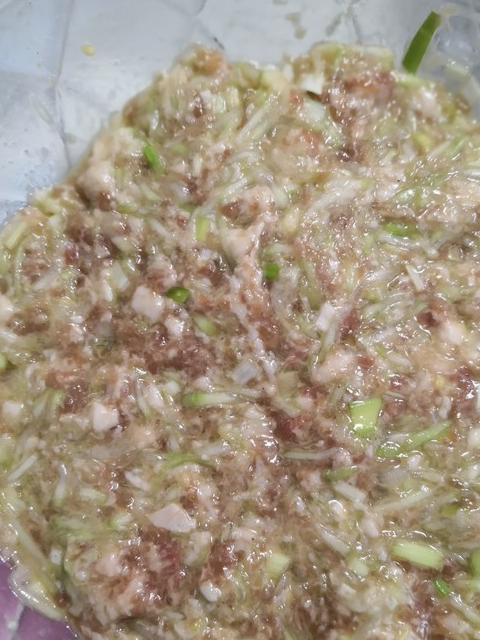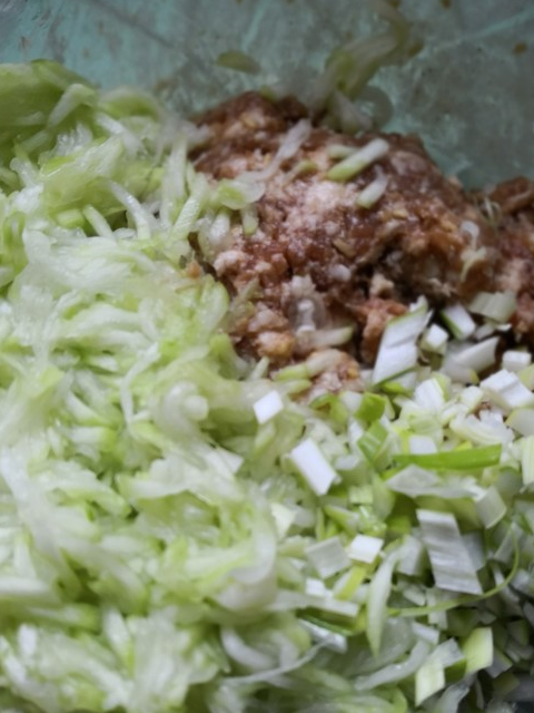 7.将瓠瓜丝,葱花放入肉馅中,同时放入适量香油。