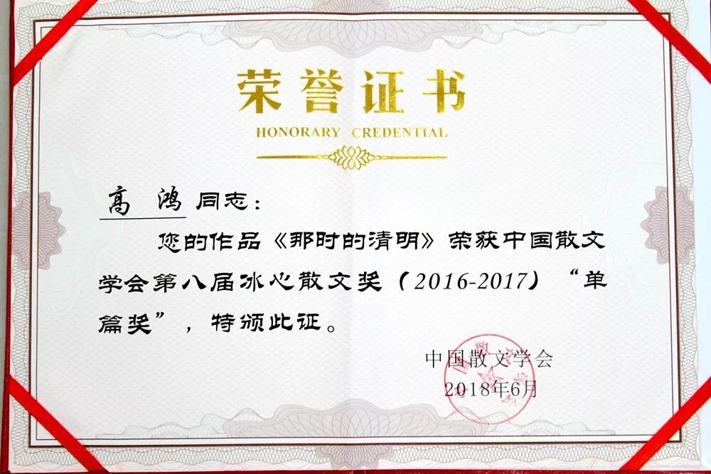 今年6月,第八届冰心散文奖颁奖仪式在四川省眉山市举行。作家高鸿的散文《那时的清明》荣获第八届“冰心散文奖”单篇奖。冰心散文奖"是中国散文学会根据冰心先生的遗愿于2000年创立的,是我国文学奖中最重要的奖项之一,代表了中国散文最高、最专业的水准。