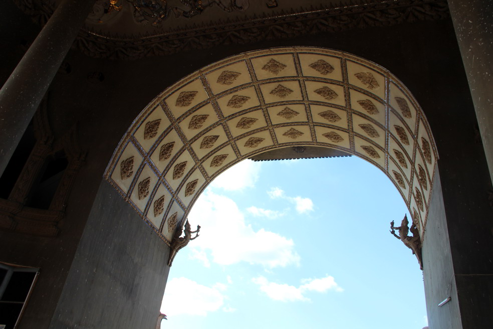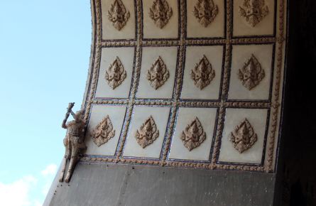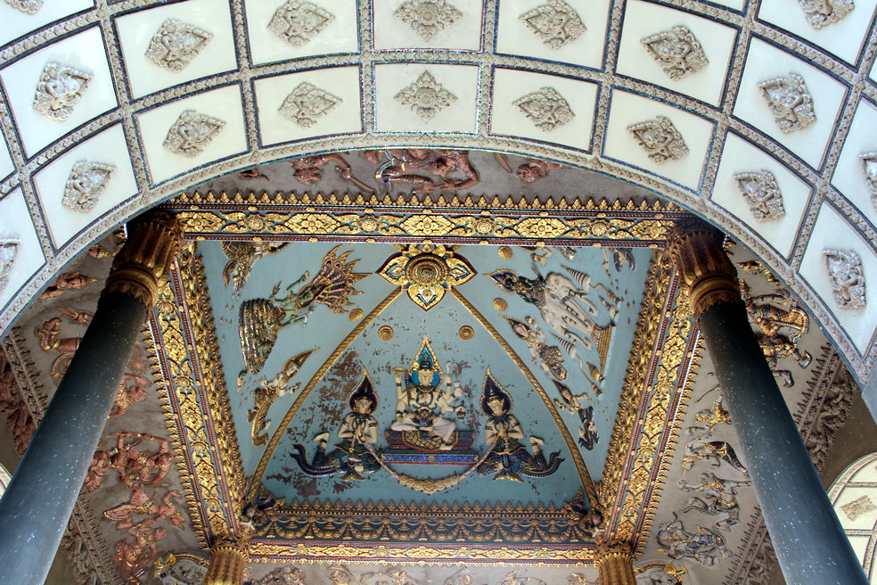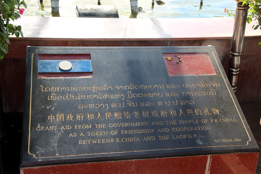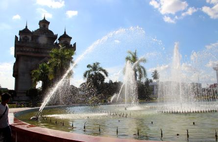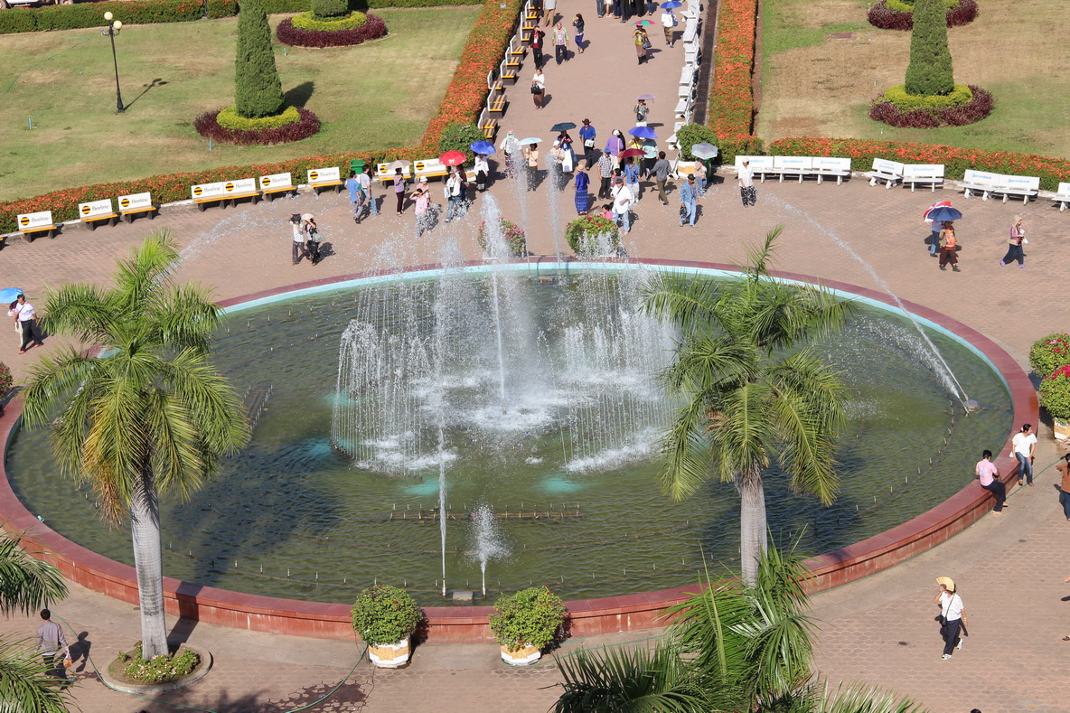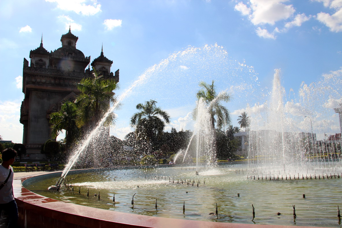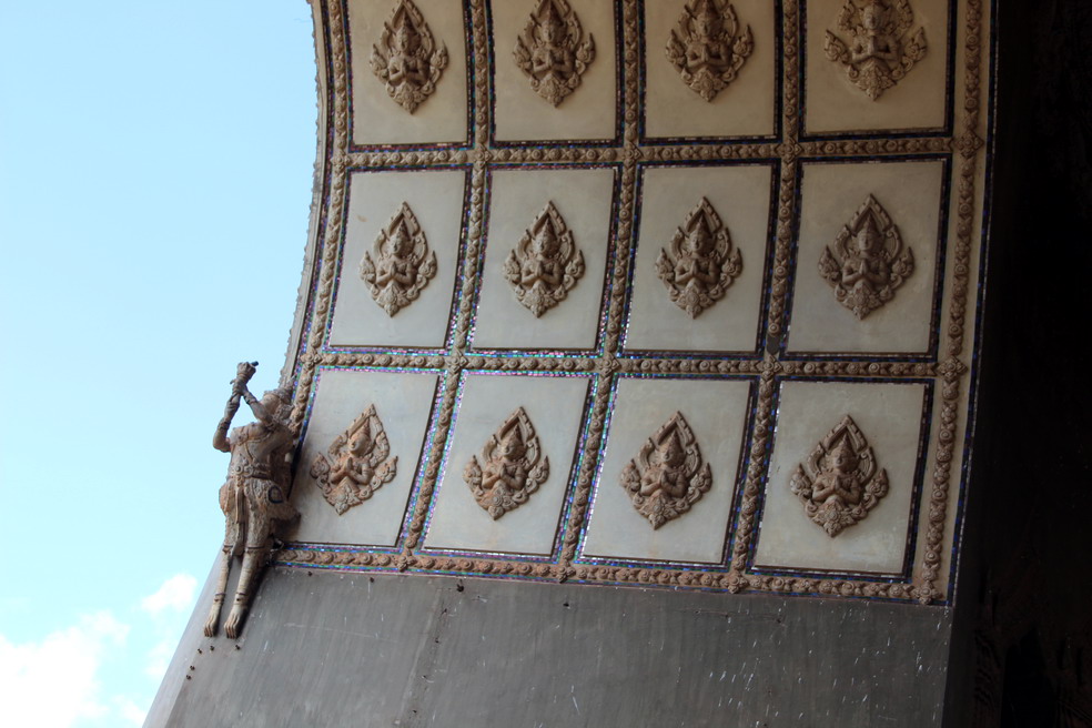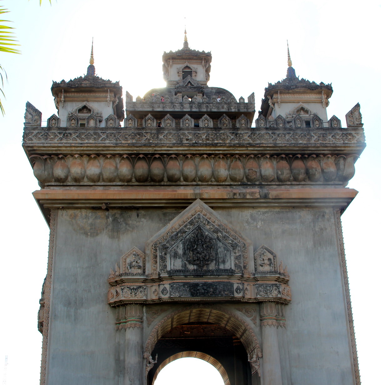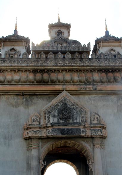 凯旋门。但在它的拱门基座上,是典型的老挝寺庙雕刻和装饰,充满佛教色彩的精美雕刻,展示了老挝传统的民族文化艺