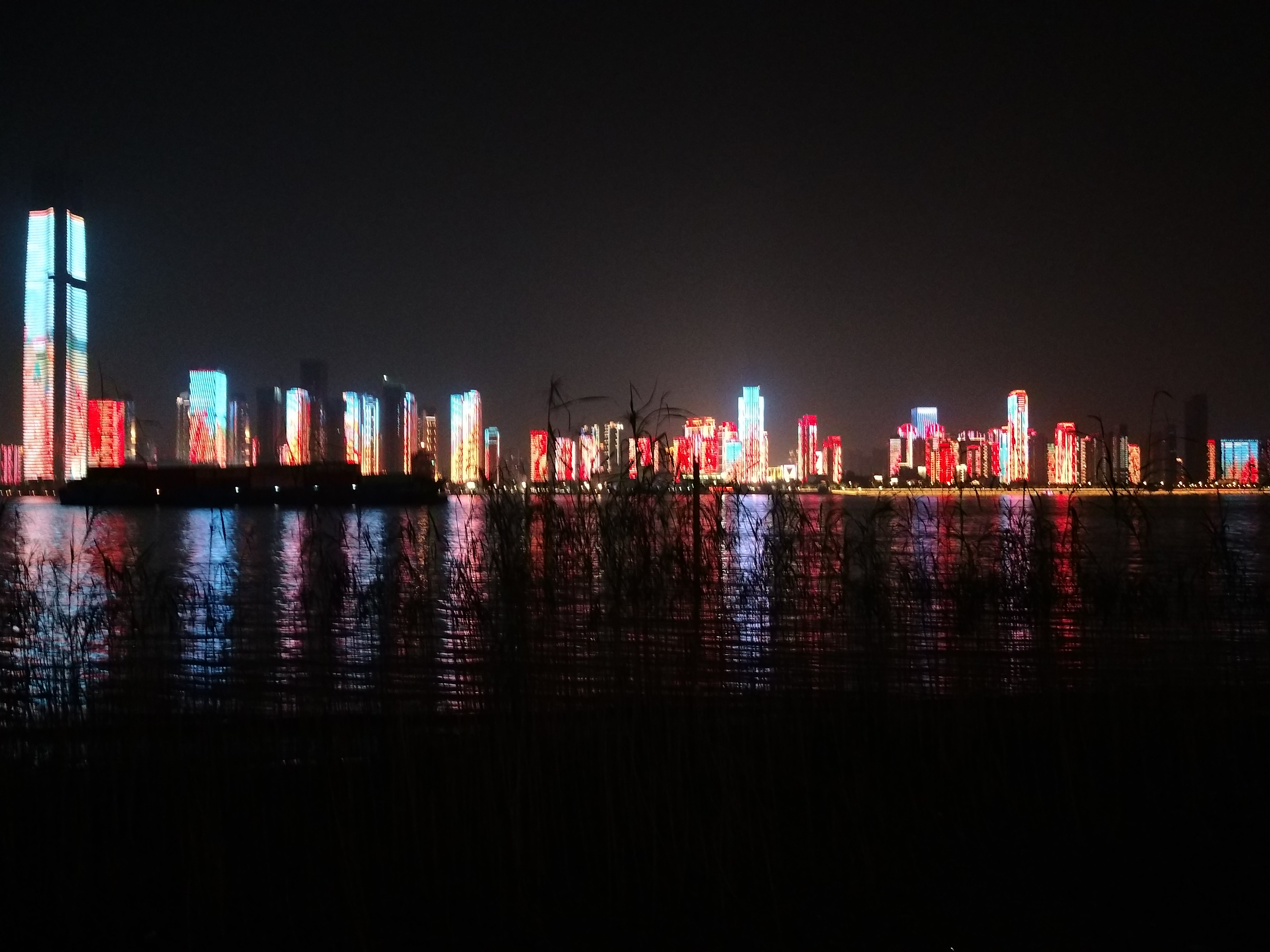 夜空阴沉,走近水边眺望,松软的泥沙依旧淤着,武昌江岸高楼的灯光闪烁,看上去没精打彩,宛若三镇居民遭遇疫情之斯时心态。