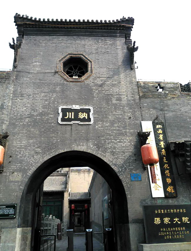 渠家大院门楼虽不及乔家宏伟,然塔楼下拱门之上嵌的“纳川”二字,将主人胸襟坦露,颇有气势与韵味。
