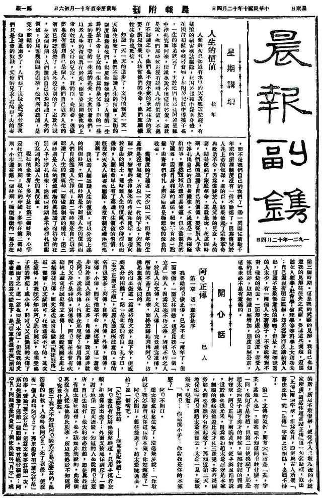 晨报副刊“开心话”连载“阿Q正传”