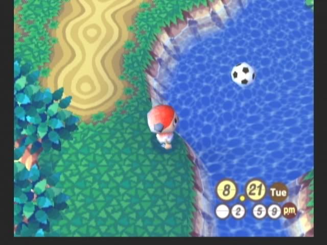 不小心(故意的...反正拿不回家...)踢到了河里面,对了,你也可以在地上用铲子挖一个坑,把足球踢进去,