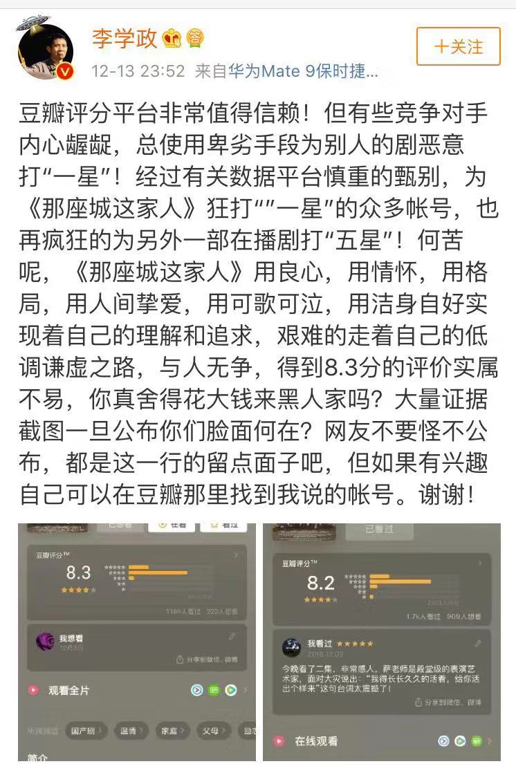 因为竞争,《那座城这家人》这部优秀的作品惨遭毒手,在豆瓣有3%的人打一星,打一星的人不知道观看该剧没有,如果他是一个心中有爱的人是绝对不会打出这一星,这只能说明他泯灭人性,或许根本就没有看过该剧。《人民的名义》总监制李学政,他也是该剧的宣传策划,李老师在微博曝光良心剧《那座城这家人》被人恶意刷低分的现象,一部有良心、有情怀,充满人间至爱和可歌可泣的故事却被人狂打一星,这目的和动机值得怀疑。该剧播出后豆瓣评分8.3分,后来被降到8分,有3%的人打一星,这是令人难以理喻的?