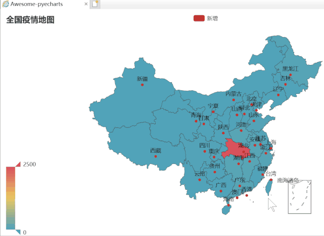 绘制的地图效果是这样的,因为湖北新增确诊人数远大于其他地区,所以看到就是这个效果了。