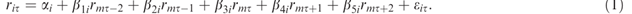 为了量化两种度量方式的股价崩盘风险,本文采用了Chen等人(2001)和Kim等(2011)提出的方法。计算公司特有的周剩余收益,方法是将公司i(第s周)的收益与同期和两个周期滞后、两期提前的CRSP价值加权市场收益率(RMS)进行回归。