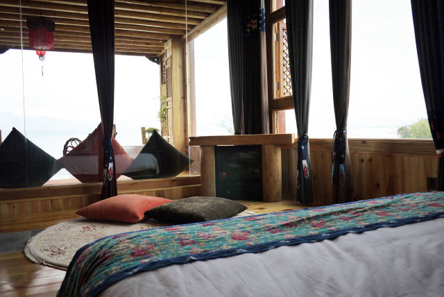 次日,海岸边的一直水鸟划过玻璃窗将我惊醒,不经意的往窗外看了一眼,突然觉得幸福惊讶喜。初到压根没好好打量的房间,原来是270°的海景房,大大的落地玻璃以及露台外就是洱海的景致,真是顿感昨晚的昏睡简直对不起这美景。