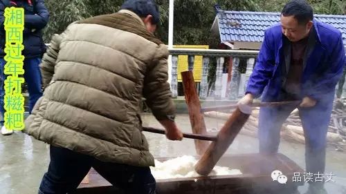 古丈农村土家族、苗族家家都在打糯米粑粑,糯米越打越烂,越烂越糯,两把木锤上,会拖出一条长长的白带,像白雪,更像一条美丽的哈达献给古丈人过猴年。两种食品都象征着两地人们过红火的日子,和金灿灿的未来,表达了人们祈福来年的美好心愿。