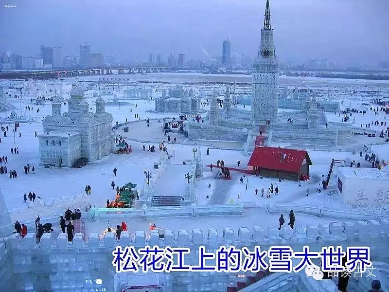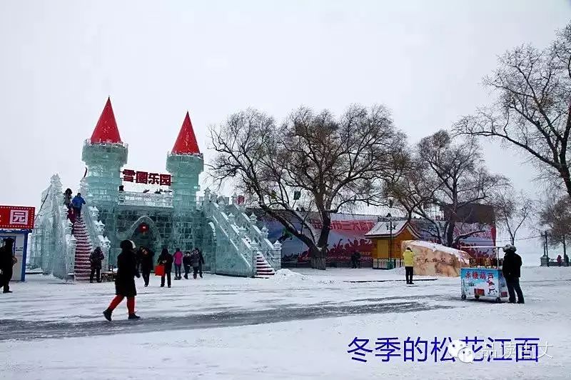 哈尔滨中央大街最北端是防洪纪念塔,纪念塔下面就是美丽的松花江,这时的松花江全部被白雪覆盖,江面上,几百人正忙着采江中的冰,用大大小小的车装运走,制作冰雕,迎接哈尔滨一年一度的冰雪节。