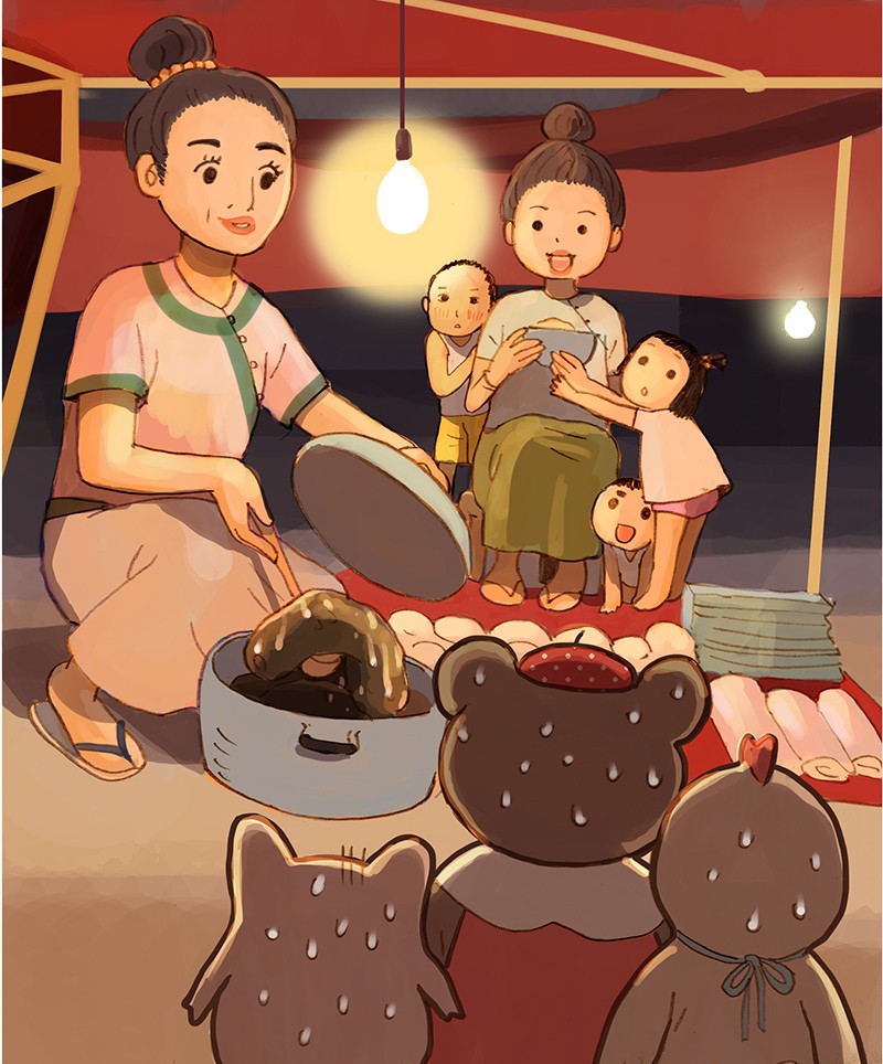 夜市里一位年轻妈妈给摆摊的家人带来夜宵,她用汤勺捞出一段黑黢黢肉呼呼的物体,有些吓人,满怀殷切的邀请我们品尝,抱着为中国人争光的必死决心,我们吞了下去!因为太害怕而忘记了味道……