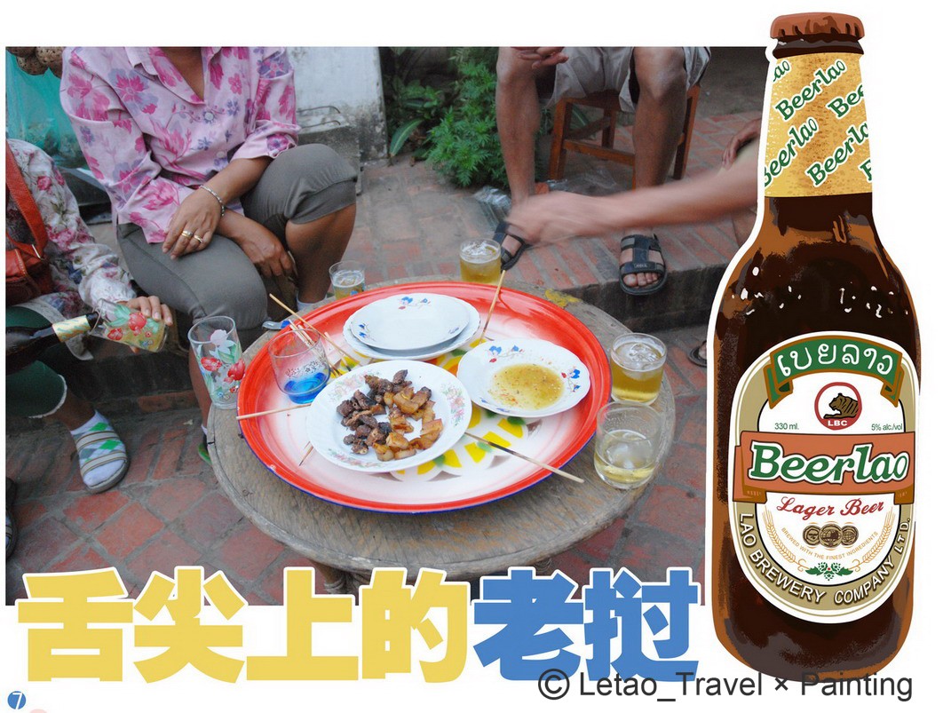 在香通寺外,正在晚餐的一家人邀请我们一起喝酒吃烧烤,BeerLao在老挝相当于中国的青岛啤酒,大家用蹩脚的英语、老挝话、中文聊天,大口吃肉、大碗喝酒,醉醺醺的道别。