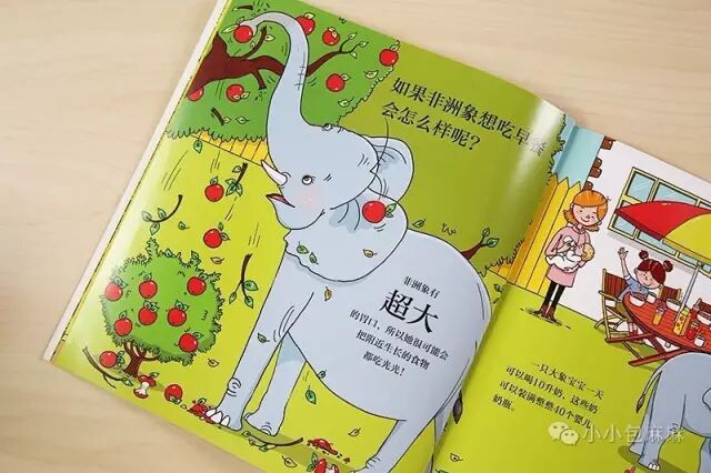 以往,遇到这样千奇百怪的问题,我总是偷偷问度娘。度娘说“小象每隔三小时要吃几公斤的奶”,呃,我有样学样告诉包子,但是小朋友显然是不懂的,也不能满足于我这样的照本宣科。而书中的回答就形象多了,“一只象宝宝一天要喝10升奶,这些奶可以装满整整40个婴儿的奶瓶”!一句话就解释清楚了,作者化繁为简的功力让人叹为观止!