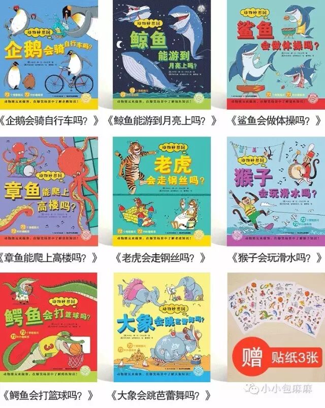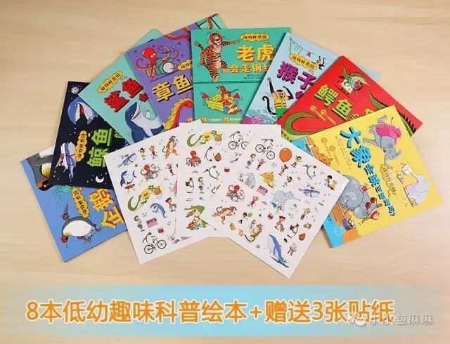 给力的价格和赠品这套书在美亚上是拆开单独销售的,精装版每本13-16美金不等,再加上高昂的国际运费,隔着屏幕都感到肉疼。这套书咱们是平装,但同样精致,每本定价18元,全套8册就是144元。包妈给大家争取到的价格是98元包邮,还送3张专属动物贴纸!不到100元,可以让宝宝脑洞大开!想象力up!up!,还可以轻松学到很多动物的小科普,真的太值得推荐了!