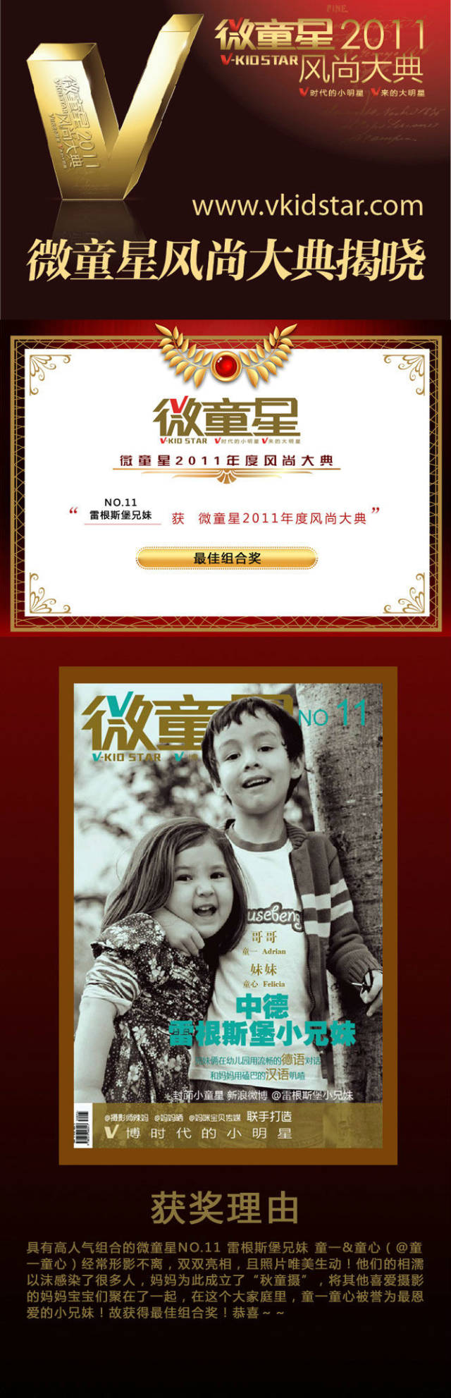 并且在2011年微童星年度风尚大典上,这对抢眼的雷根斯堡小兄妹——童一和童心,凭借粉丝们的喜爱荣获了“最佳组合奖”。
