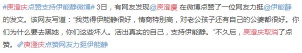 最近,在诸多嫌弃吐槽声中,有一条夸赞力挺伊能静的发声,可以说很难得。而眼尖的网友发现,伊能静前夫居然点赞这条微博,算是无声的支持了,能得到前夫的支持,对伊能静也是莫大安慰和鼓励。谁知道庾澄庆随后又取消了点赞,一前一后的举措,让人搞不懂了,不知道是庾澄庆之前手滑了点赞,又取消,还是觉得不妥才取消,总之是对伊能静的一次不大不小的无声打击。