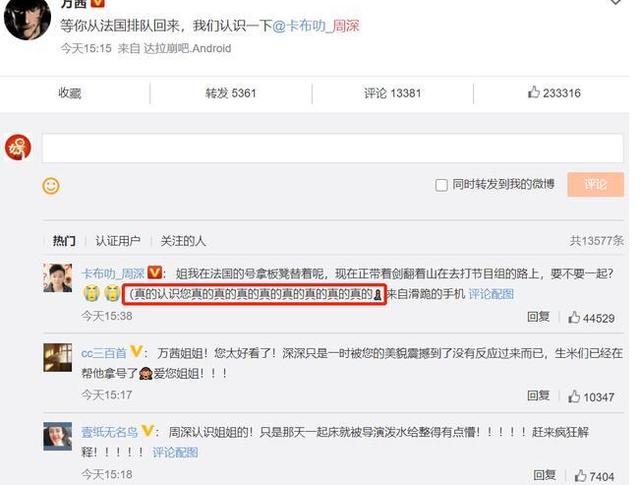 没想到节目组最近又故技重施,又是认人游戏环节,周深又因为不认识另一位姐姐万茜,随后被万茜喊话让他在法国排队认识完张雨绮后去认识她。很明显这次的梗和上次一模一样,也是因为万茜最近参加节目很火,而万茜为什么会来找周深,也是学习了张雨绮,很是搞笑。随后周深又是道歉。