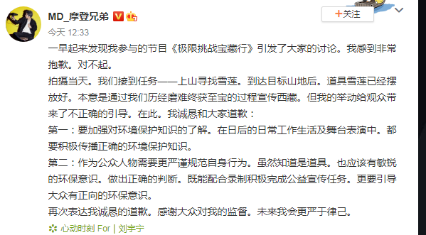 但是没想到刘宇宁不仅是这次节目的流量担当,还成了话题担当,而且是负面话题的躺枪背锅侠。因为在节目中设置了采摘雪莲的游戏环节。这个游戏本身并没有什么问题,但是播出之后,被网友质疑采摘的是国家保护的植物,遭遇不少质疑非议。即使后面解释这是节目组的道具,为了节目效果而已,但还是因为节目表达传递不对,也只能认错道歉。