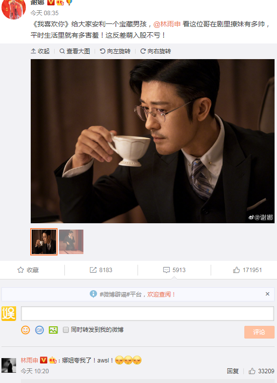 因为与赵露思的吻戏,林雨申又俘获了不少粉丝,连谢娜都忍不住为他宣传造势,说他在剧中多会吻,现实中就有多矜持,看来虽然林雨申英年早婚到了魅力腊肉大叔年龄,演戏还是有点放不开,这次还得感谢赵露思这个小十几岁的妹子的带动,让他的感情戏更加出彩,也沾光火了一把。