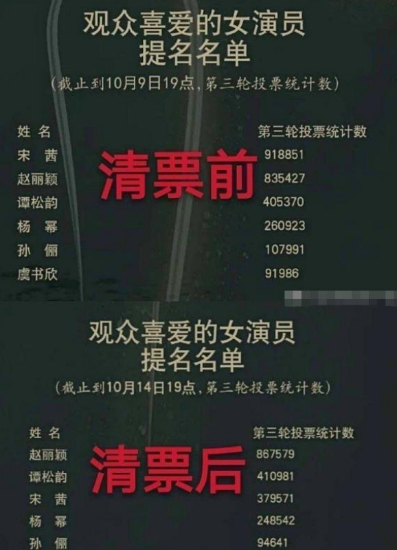 而在奖项揭晓前几天,官方对某些提名者的票数进行清理,那就更尴尬了。宋茜从排名第一到了第三,票数大缩水,赵丽颖则众望所归地排名第一,而且保持到最后。这个奖项本来就没什么专业性,只是拼人气,本来宋茜可能像商界金鹰女神迪丽热巴一样包揽多个大奖,没想到这次基本上是空手而归,还因为投票和礼服原因遭遇质疑,真的是得不偿失。