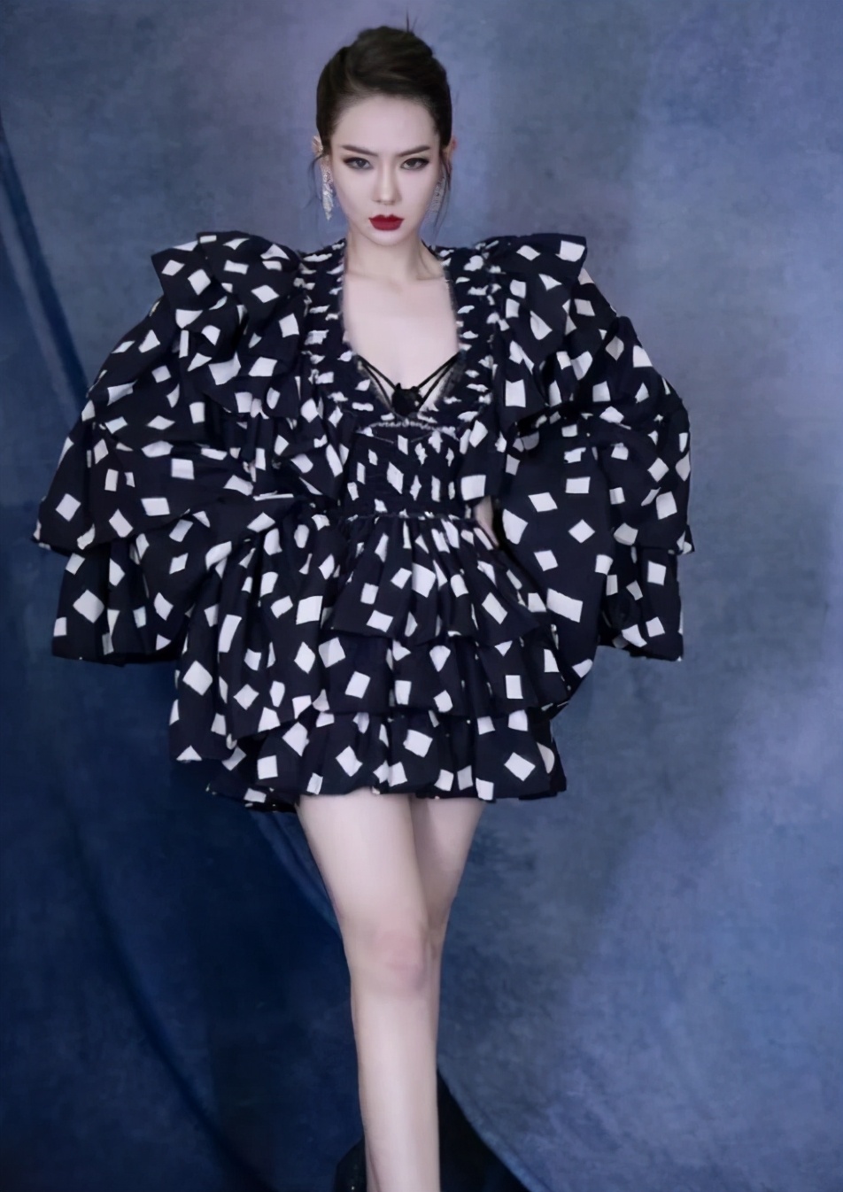 这次也有几位造型失败的,比如戚薇。本来戚薇漂亮,身材气质很好,红毯造型一向不错,但这次短裙的袖摆设计,太过重复荣誉,堆在一起像是鸵鸟,加上高冷的妆容和霸气的眼神,更像是虎视眈眈的鸵鸟。