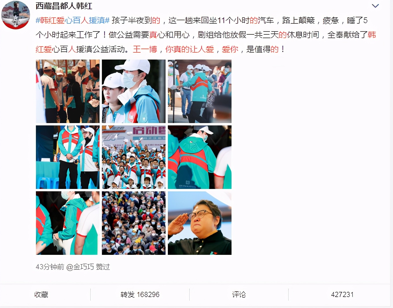 现在,韩红的公益慈善队伍越来越壮大,不断有小鲜肉加入,王一博就是其中的代表。最近,韩红发文,单独点名夸奖王一博,说他不辞辛劳,利用难得的休息,参加公益活动,很真心很用心,还夸他值得大家喜爱。这可是很好的评价,粉丝们也觉得光荣,没追错爱豆。