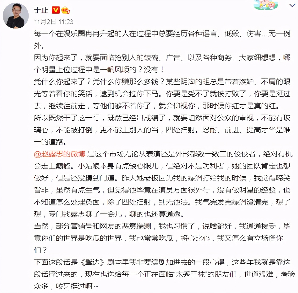 而这件事的起因,其实也是于正自己瞎凑热闹博关注。因为赵露思今年走红,关于她的流言蜚语很多,甚至还牵扯到赵丽颖、宋茜和肖战,但本尊又觉得很无辜,于是被其他几家粉丝觉得她很虚伪,嘲讽她是“绿茶”。而偏偏这时候于正就发绿茶照片,自然被网友质疑他疑似蹭热度。后来。于正就大大方方对赵露思这位曾经合作过的艺人进行点评,明褒暗贬,好好蹭了一波热度。